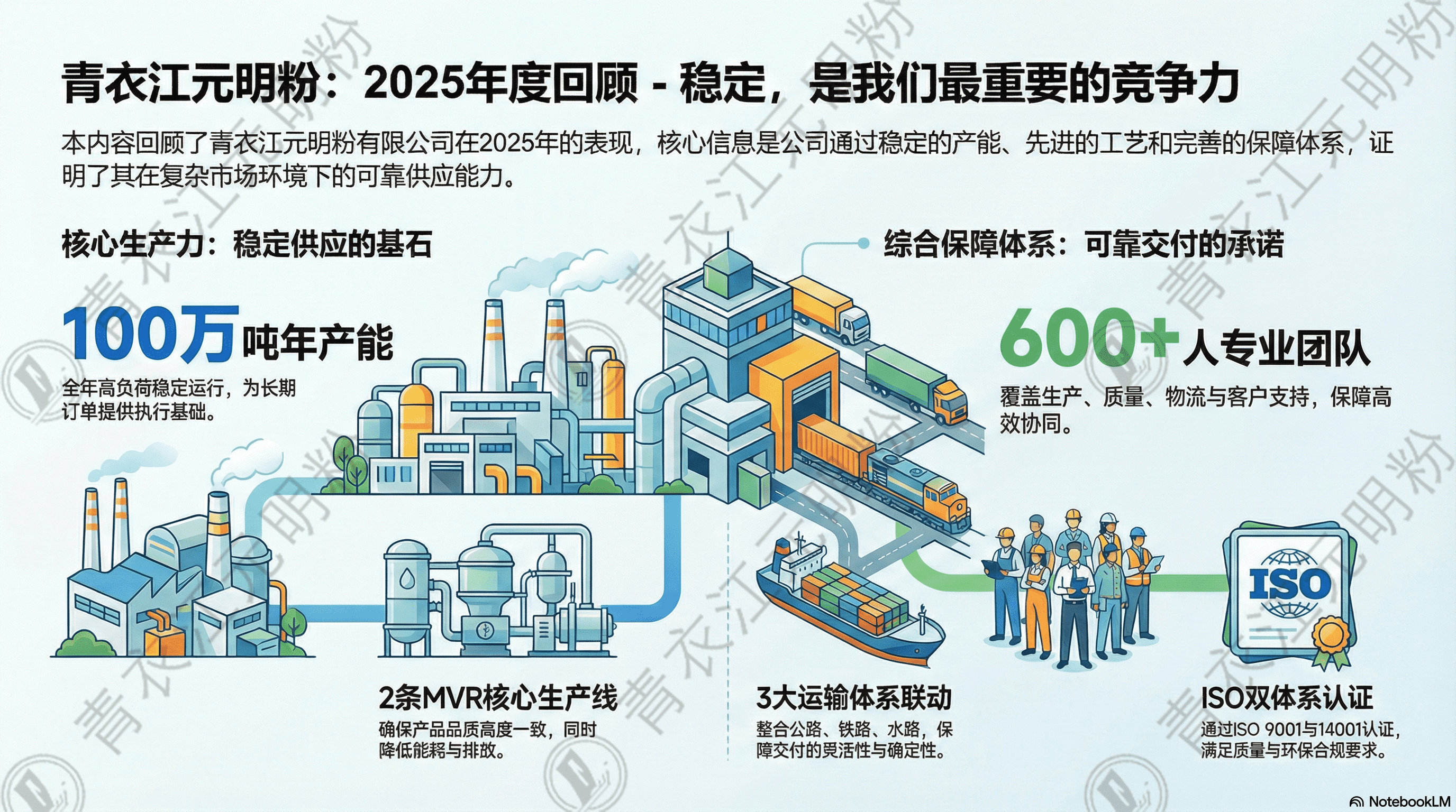 要點速覽穩定供應被再次驗證2025 年,青衣江元明粉有限公司以穩定產能、可復制工藝和自有原料資源,應對 行業波動,全年交付體系運行平穩,為長期采購提供了確定性基礎。MVR 工藝成為品質與環保的共同支點以兩條 MVR 元明粉生產線為核心,公司在產品一致